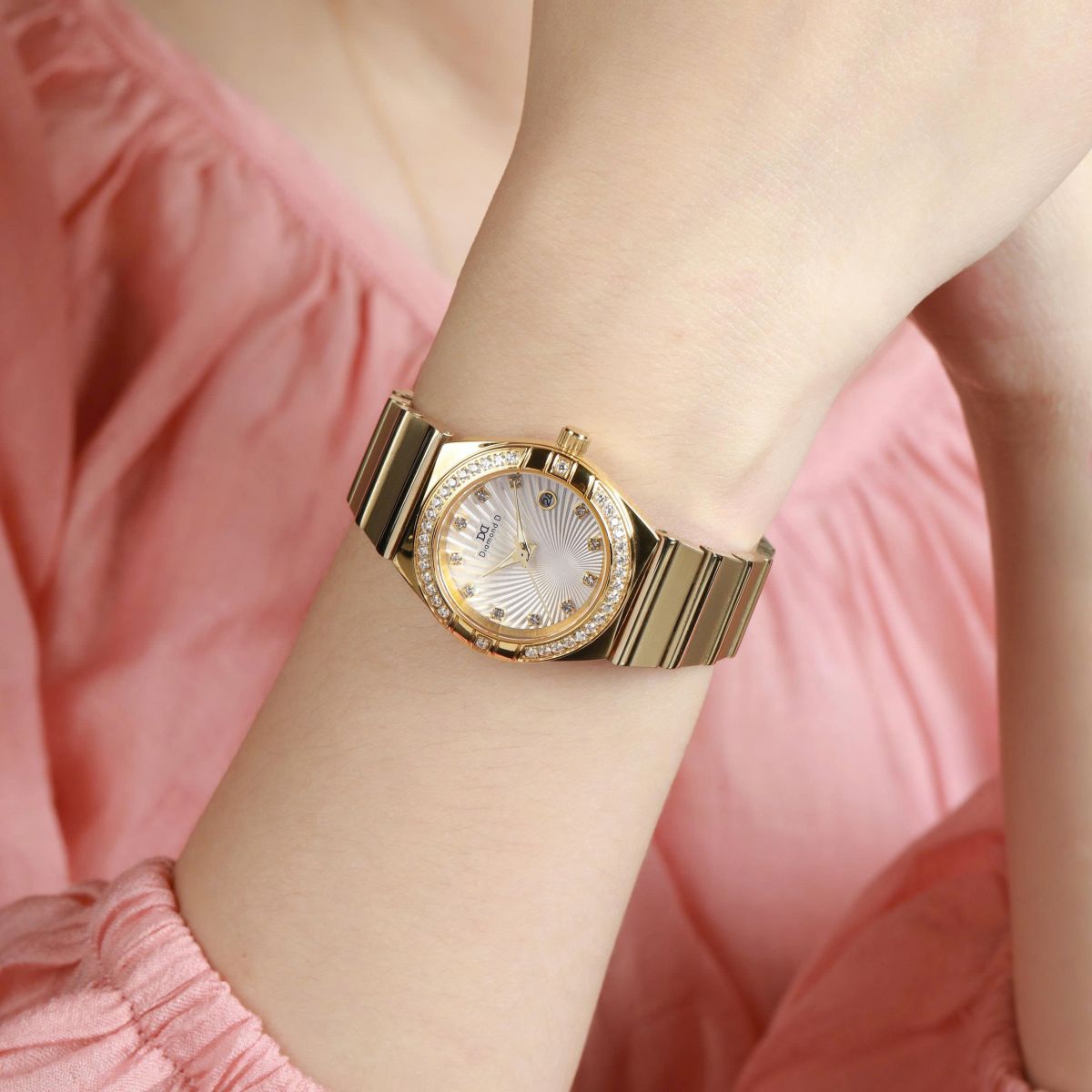 Mặt số vàng ánh kim được trang trí họa tiết tia sáng lan tỏa, viền đính đá lấp lánh và dây demi vàng – bạc sang trọng, mang đến vẻ đẹp cuốn hút và thời thượng. Mẫu đồng hồ Diamond D này gợi lên hình ảnh người phụ nữ hiện đại – tự tin, bản lĩnh nhưng vẫn đầy dịu dàng.